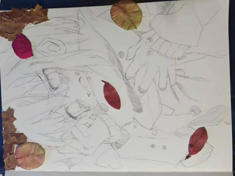 几片形状各异的叶子,它们的纹理与色彩像是承载着季节的私语。那一刻,脑海中浮现出一个在时光里徘徊的身影——她或许正被成长的困惑、情感的涟漪所缠绕,就像落叶般在人生的风中飘摇。以笔为媒介,让这个身影在画纸上成形、又将那些带着秋天气息的叶子安置在画面里,仿佛是让现实的碎片闯入了她的精神世界,记录下那一瞬间关于迷茫、关于眷恋的心灵低语。