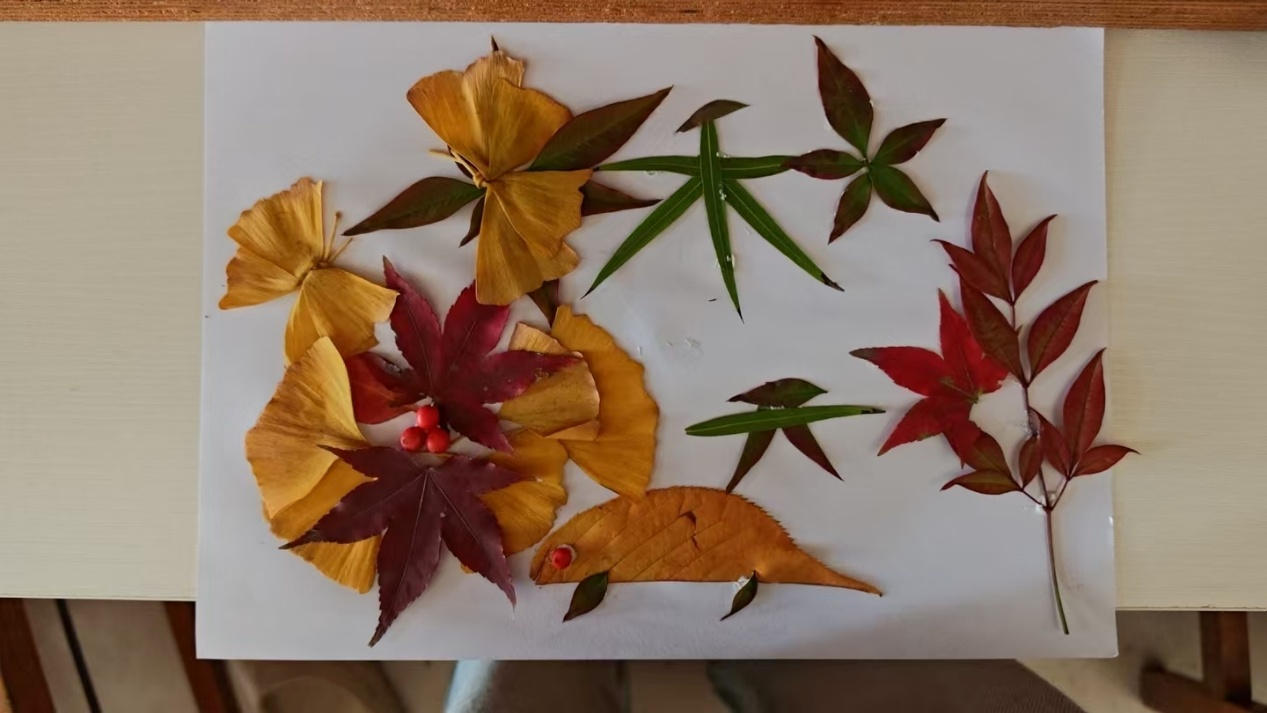 作品介绍:本作品以秋日自然素材为核心,选取银杏叶、枫叶、竹叶等不同形态与色彩的秋叶,结合红果元素,通过拼贴手法构建出“秋野间生灵跃动”的微观场景,对“逝去与新生”的心理接纳,微观世界里的情绪疗愈,与自然联结的情感投射,对“不完美”的温柔包容。