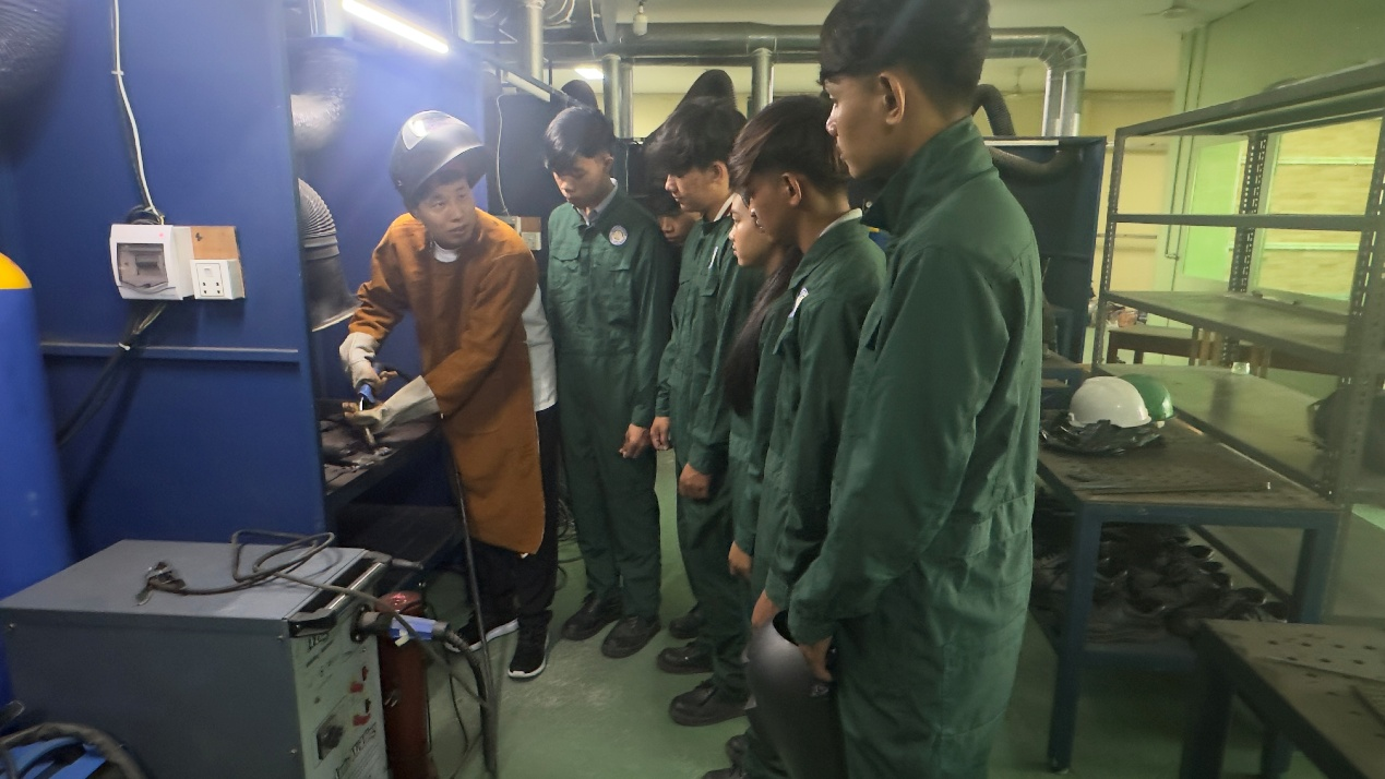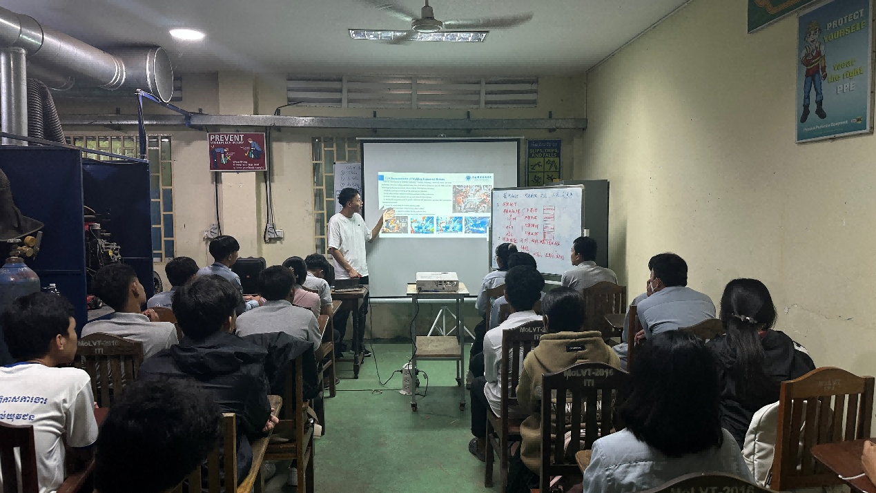 太阳成集团王亚强老师负责智能焊接技术培训模块。50天的培训中,他克服语言沟通不畅、生活不便等种种困难,花费大量时间精心备课,理论课上融入简单易懂又贴近实际的案例进行通俗易懂地讲解,实操课上手把手教导员工掌握每一个焊接要领。王亚强老师的倾心付出,使柬埔寨员工获得宝贵的“中文+”复合型技术技能,同时,也给柬方职业院校输送了智能焊接职业培训标准和经验,进一步深化了中柬职业教育国际合作与友谊。