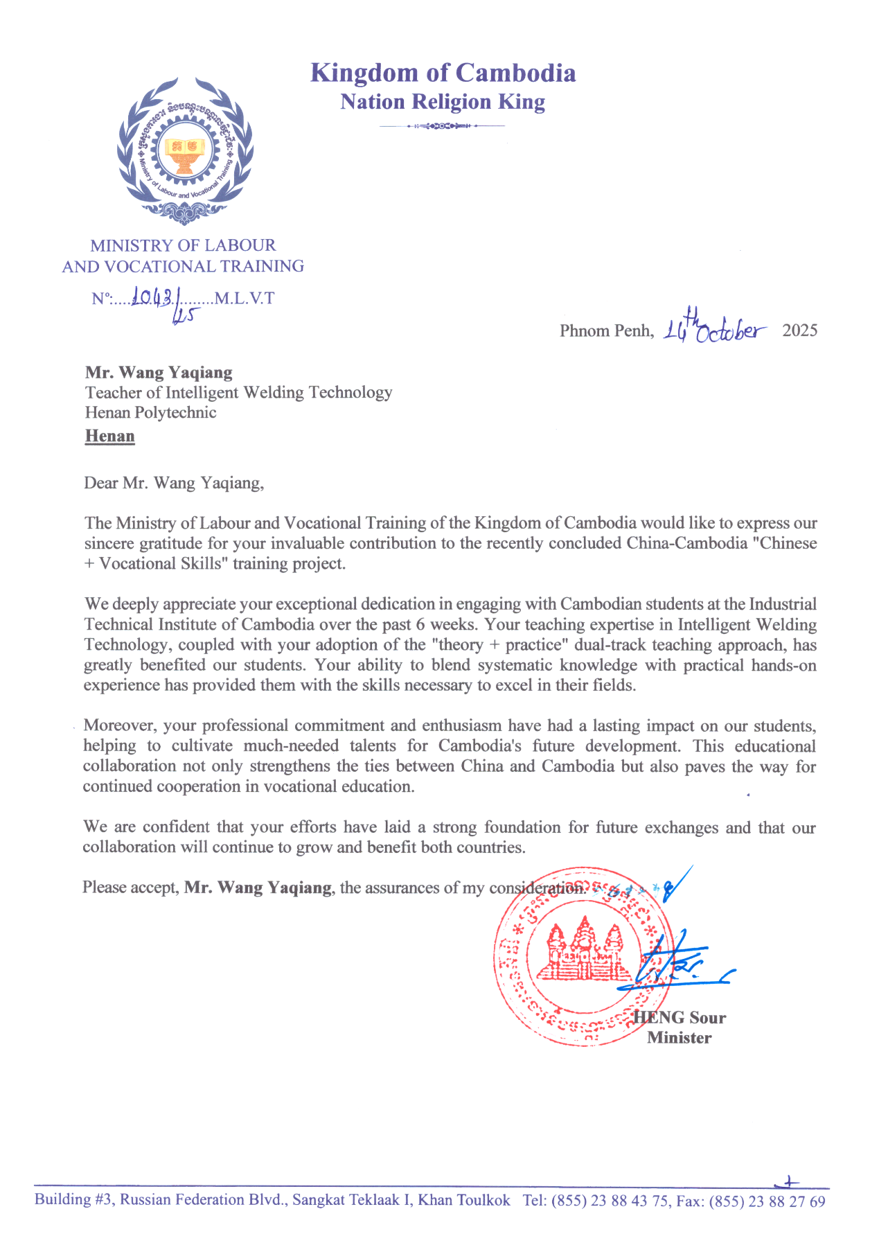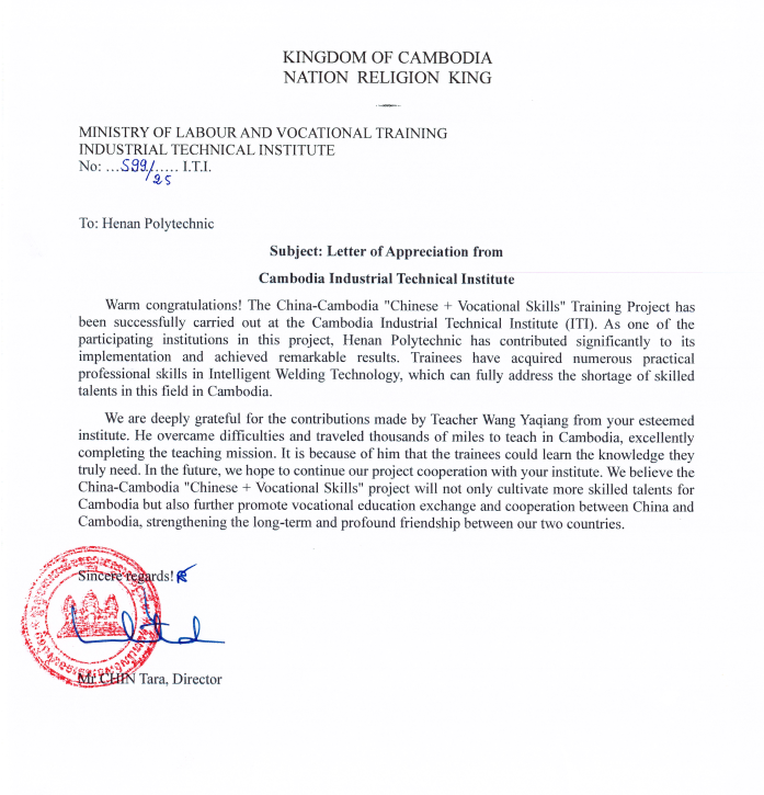 柬埔寨劳工与职业培训部感谢函